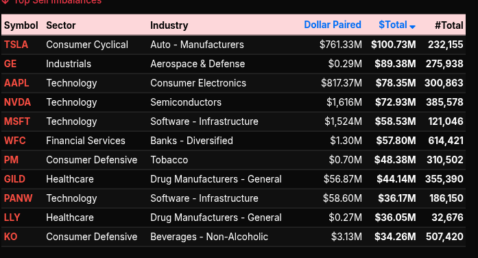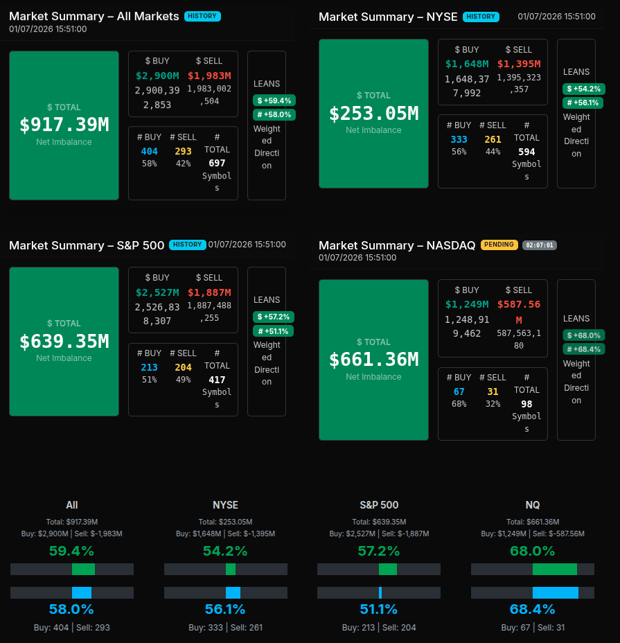 Single-stock imbalances reinforced this narrative. Large buy interest clustered in mega-cap tech and communication names, while select industrial and cyclical symbols absorbed persistent sell pressure. By the final print, the auction resolved with a clear net buy bias across All Markets, the S&P 500, and especially Nasdaq, where the percentage lean approached the upper end of the range—evidence that growth and tech leadership remained firmly in control into the close.
