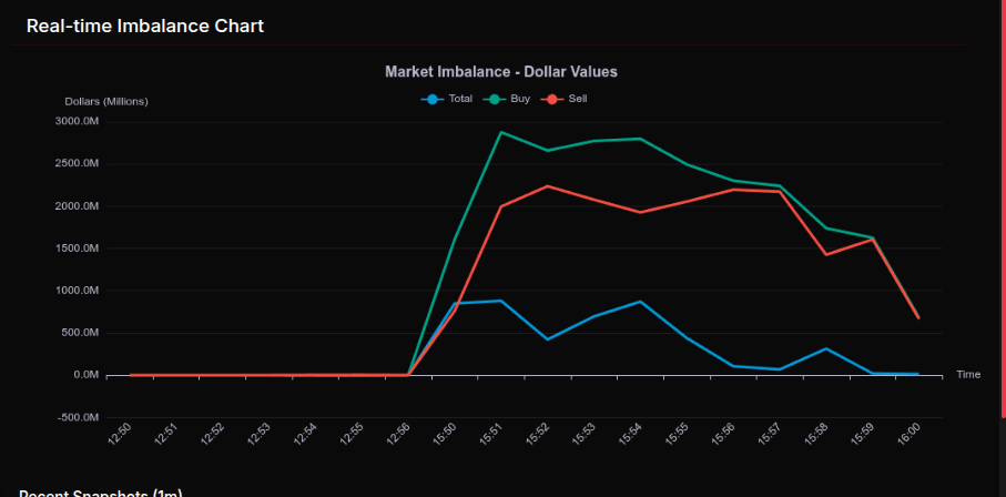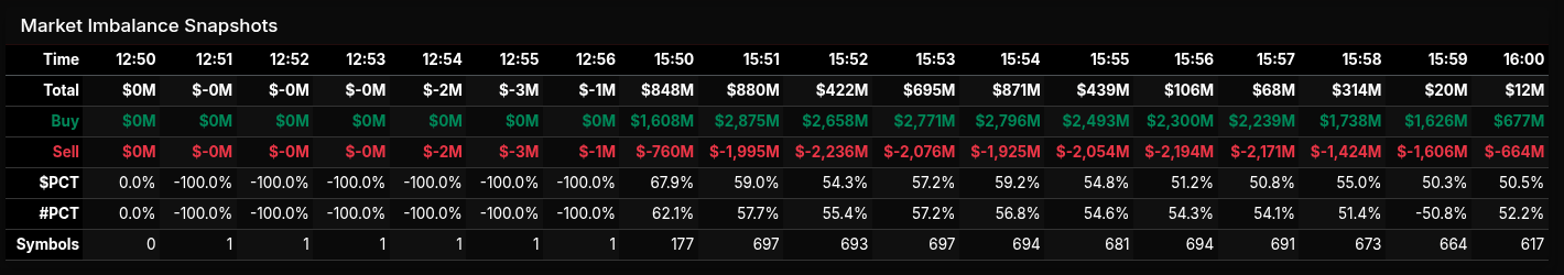 From 15:50 through roughly 15:55, buy dollars expanded aggressively, peaking near $2.8B while sell interest also climbed, keeping the tape volatile. This created a classic MOC push-pull: headline net imbalance stayed positive, but internal rotation was evident as sell programs chased strength rather than capitulating. After 15:55, buy pressure began to fade incrementally, though it remained dominant into the close, allowing the auction to finish with a firm net buy imbalance.