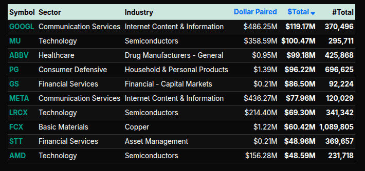 Sector behavior confirmed a mix of wholesale buying and rotation. Communication Services and Technology stood out with strong positive dollar totals and percentage leans well north of 66%, signaling institutional-scale demand rather than passive rebalancing. Technology, in particular, saw heavy participation across mega-cap software and semiconductor names, reinforcing its role as the primary buy vehicle. Financial Services and Healthcare also posted solid positive leans, but closer to the 50–60% range, suggesting more rotational flow rather than outright accumulation.
