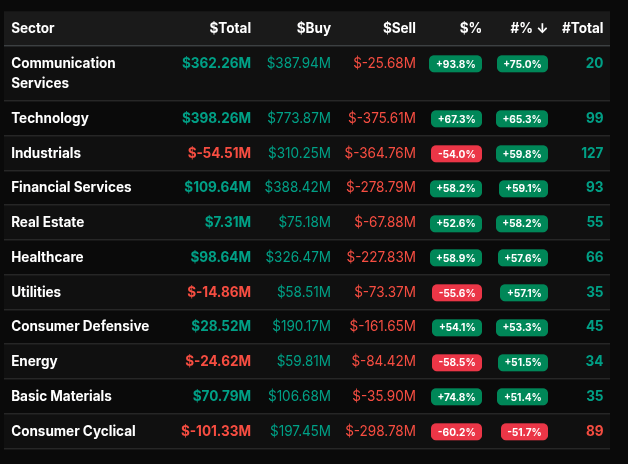 On the sell side, Consumer Cyclical and Industrials were notable drags. Both sectors posted deeply negative totals with percentage leans beyond -50%, pointing to more decisive distribution. Energy and Utilities also leaned lower, though their smaller dollar magnitudes suggested secondary reallocation rather than a broad exit.