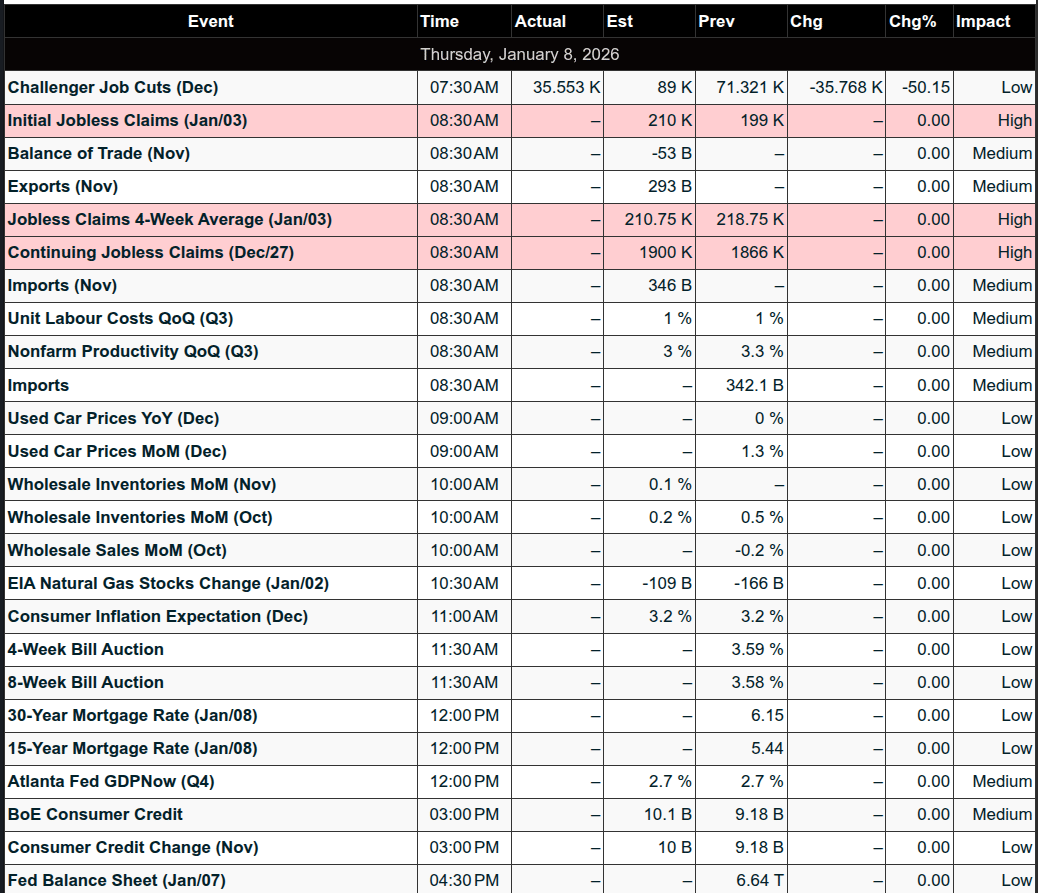 • Market volatility has trended higher in early 2026. Short‑term ranges are expanding, with ES 5‑day average moves growing. Bullish bias into today’s Unemployment Claims persists on thinner overnight flows.