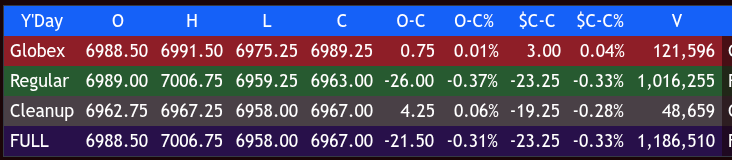 In the end, the ES rallied up to 7006.75 but weakened as multiple late headlines hit the tape. I warned in the chat that I didn’t think it was a good idea to get long above 7000.00 the first time up, as “everyone” got long into the rally.