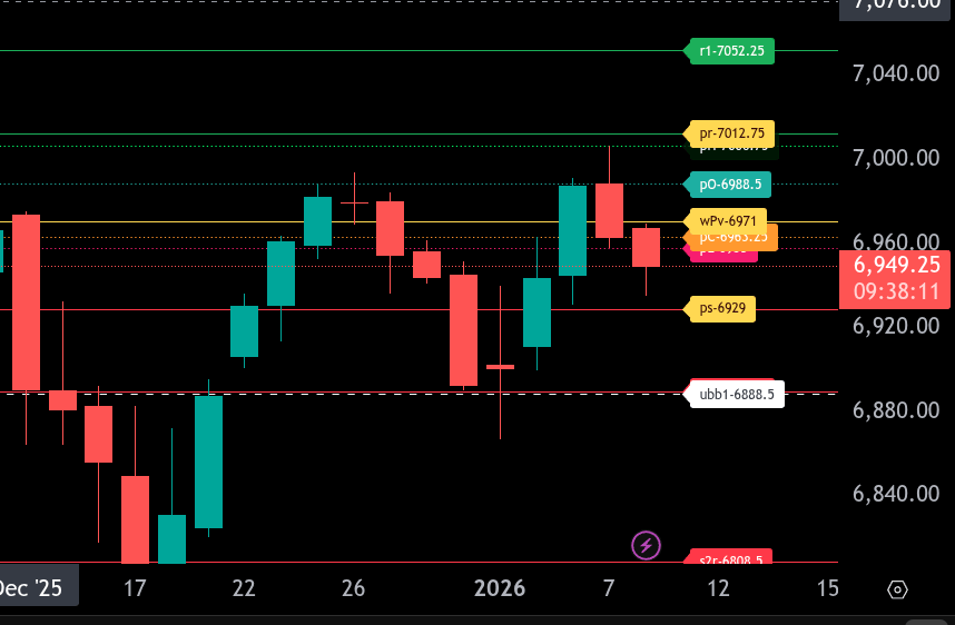 On the upside, resistance comes in first at 6988.50, followed by 7006.75. The upper range target is defined at 7012.75, with an extension toward 7052.25 if buyers regain 6971.00 and hold above it.
