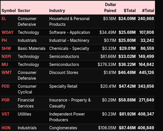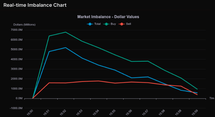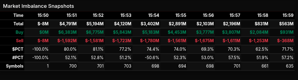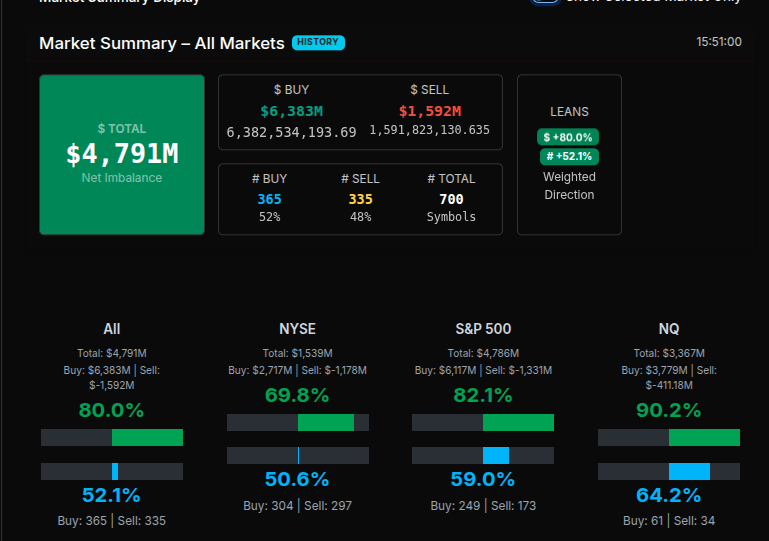 Market-on-Close (MOC) data confirmed strong institutional participation. The 3:51 PM reading showed a $4.79 billion net buy imbalance, with 80% of dollar flow and 52% of symbols leaning to the buy side. The S&P 500 saw 82.1% of its symbols bought, and the Nasdaq 100 an even stronger 90.2%. Leadership came from technology and communication services, led by AAPL (+$490M), NVDA (+$434M), and MSFT (+$361M) buy imbalances. Sector flows reflected aggressive accumulation across tech, financials, and cyclicals, while defensive and utilities sectors faced mild profit-taking.