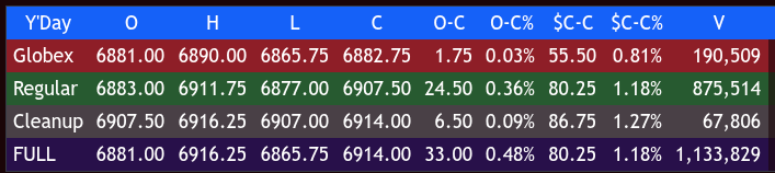 The cleanup hour added a modest continuation bid, with prices opening at 6907.50 and closing at 6914.00 (+6.50 pts, +0.09%), completing a full-session gain of +80.25 points (+1.18%) from the prior cash close. Volume was light, totalling 875,514 contracts during the day and 1.13 million across all sessions.
