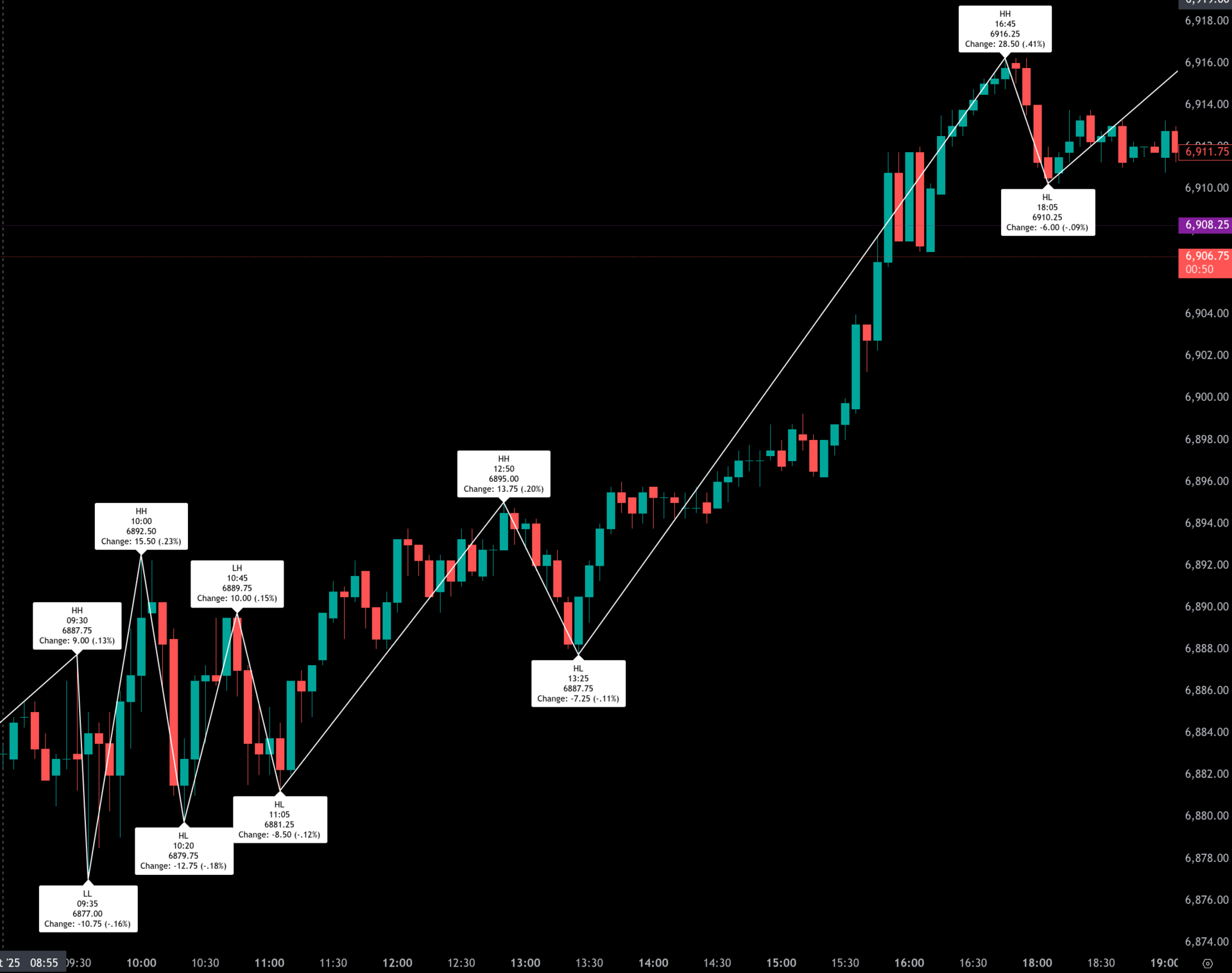 The regular session opened at 6883.00 and briefly probed lower, tagging 6877.00 at 9:55 AM. Buyers quickly reclaimed control, lifting the ES to 6892.50 by 10:00 AM, then fading slightly to 6885.75 at 10:55 AM. The late morning and midday trade featured orderly higher lows and consistent buying programs that pushed price to 6895.50 at 12:50 PM. After a shallow pullback to 6887.75 at 1:05 PM, momentum accelerated into the afternoon as buyers pressed into new ground. A powerful push between 1:30 PM and 3:45 PM lifted ES to the session high at 6916.25, where it paused just before the bell. The futures settled the regular session at 6907.50, added 24.50 points (+0.36%) from the open as bulls controlled nearly the entire session. The session maintained the overnight gap and was up 80.25 points (1.2%) from Friday’s close.