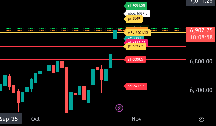 Currently, ES is trading around 6907.50, showing a slight positive bias above the bull/bear line. Immediate resistance sits at 6916.25, followed by the upper range target at 6949. If momentum builds through that level, 6967.50 to 6994.25 become the next upside objectives.