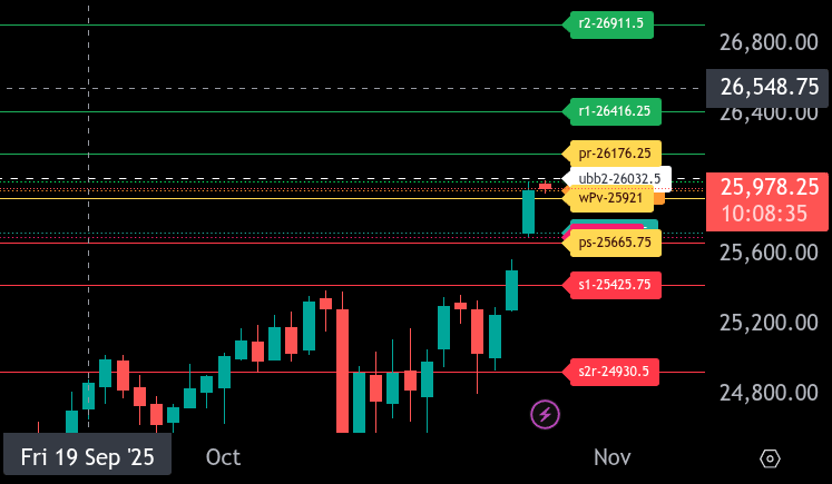 In summary, the short-term tone remains mildly bullish above 25,921, but momentum could fade quickly if price slips back below this pivot. Watch for confirmation through the 25,965–26,030 zone early in the session to gauge direction for the day.