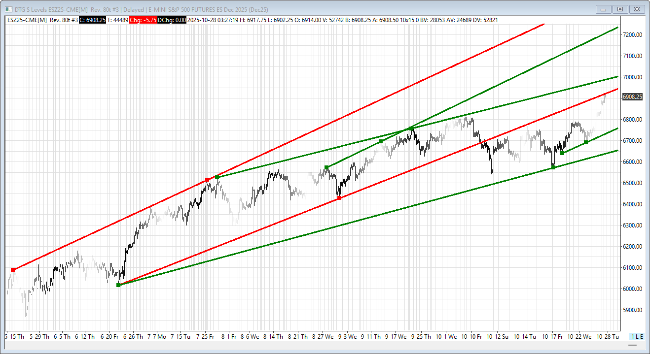In terms of overall tone, the NQ has been rate-cut-supercharged and has been leading the ES higher for the last three sessions: 10/25 up 0.56%, 10/24 up 0.77%, and 10/27 up 1.3%. Over the same three days, the NQ rose +0.86%, +1.01%, and +1.78% yesterday, totaling a 3.65% gain. Volume in the ES was 1.28 million contracts traded.