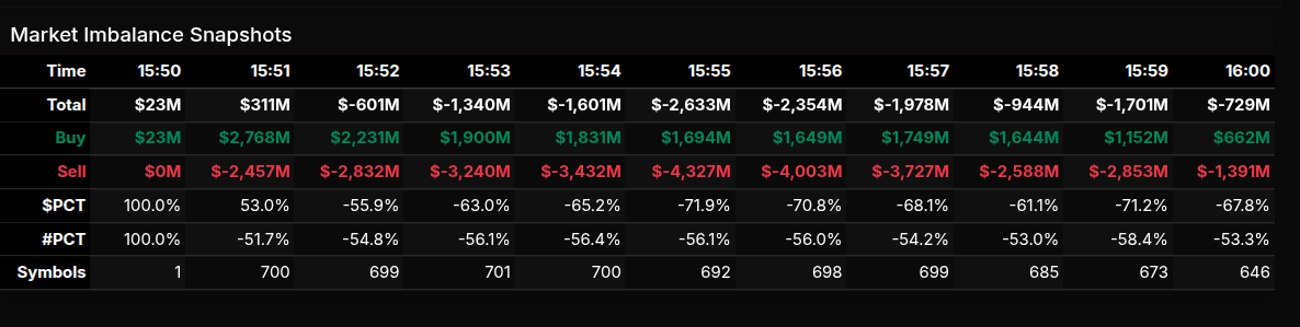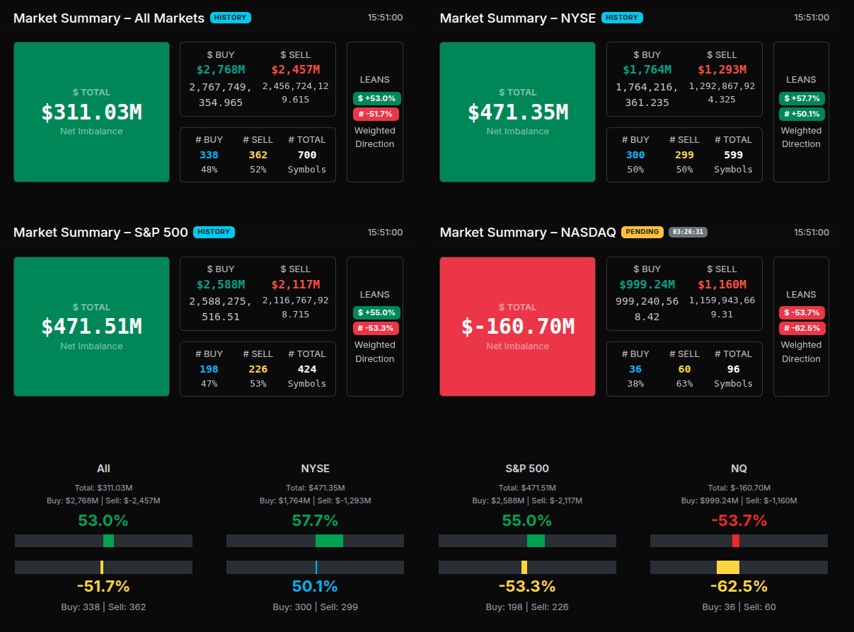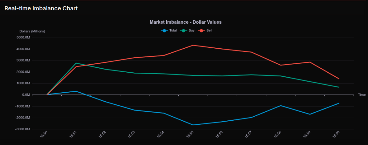 Net-net: the MOC session opened buy, transitioned into a broad mid-run sell program led by Nasdaq and Healthcare/Financials supply, and closed with partial relief. The most notable wholesale signals were the Real Estate and Consumer Defensive buys (>+66%), while Technology’s near-50% lean flagged rotation rather than capitulation.