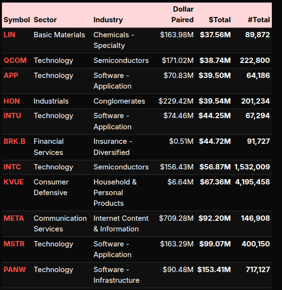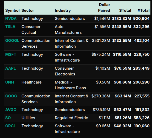 Single-name flow mirrored that split. On the buy side, large bids clustered in mega-cap tech and adjacent growth: NVDA, TSLA, GOOGL/GOOG, MSFT, AAPL, AVGO, ORCL, plus defensives like SO and a healthcare anchor in UNH. On the sell sheet, pressure showed up in LIN, QCOM, APP, HON, INTU, BRK.B, INTC, KVUE, META, MSTR, and PANW—an eclectic list spanning semis, software, and staples, consistent with the mid-auction liquidation wave.