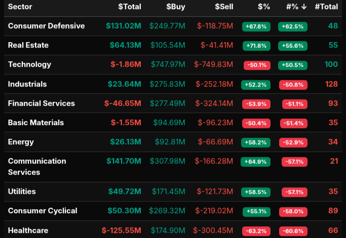 Sector flows were distinctly defensive. Consumer Defensive (≈ +$131M) and Real Estate (≈ +$64M) showed the day’s strongest wholesale demand, with leans north of +66%—classic MOC shelter-seeking. Communication Services (≈ +$142M), Utilities (≈ +$50M), Energy (≈ +$26M), Industrials (≈ +$24M), and Consumer Cyclical (≈ +$50M) were net buys, though with more mixed leans. Healthcare (≈ −$126M) and Financials (≈ −$47M) were the primary sources of supply; Healthcare’s lean pushed toward the −66% line, signaling near-wholesale selling. Technology was essentially rotational: near a 50/50 lean with a slight negative net (≈ −$1.9M), suggesting active two-way flows rather than a broad tech de-risk.