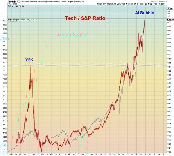 Compare that to today where as of early November 2025, the combined notional value (market capitalization) of the technology and AI stocks represents a dominant force in the U.S. stock market, with the S&P 500 Information Technology sector valued at approximately $24.771 trillion, and the entire Nasdaq-100 index carrying a total market cap of approximately $25.34 trillion, driven heavily by major AI-focused companies.
