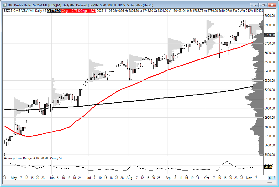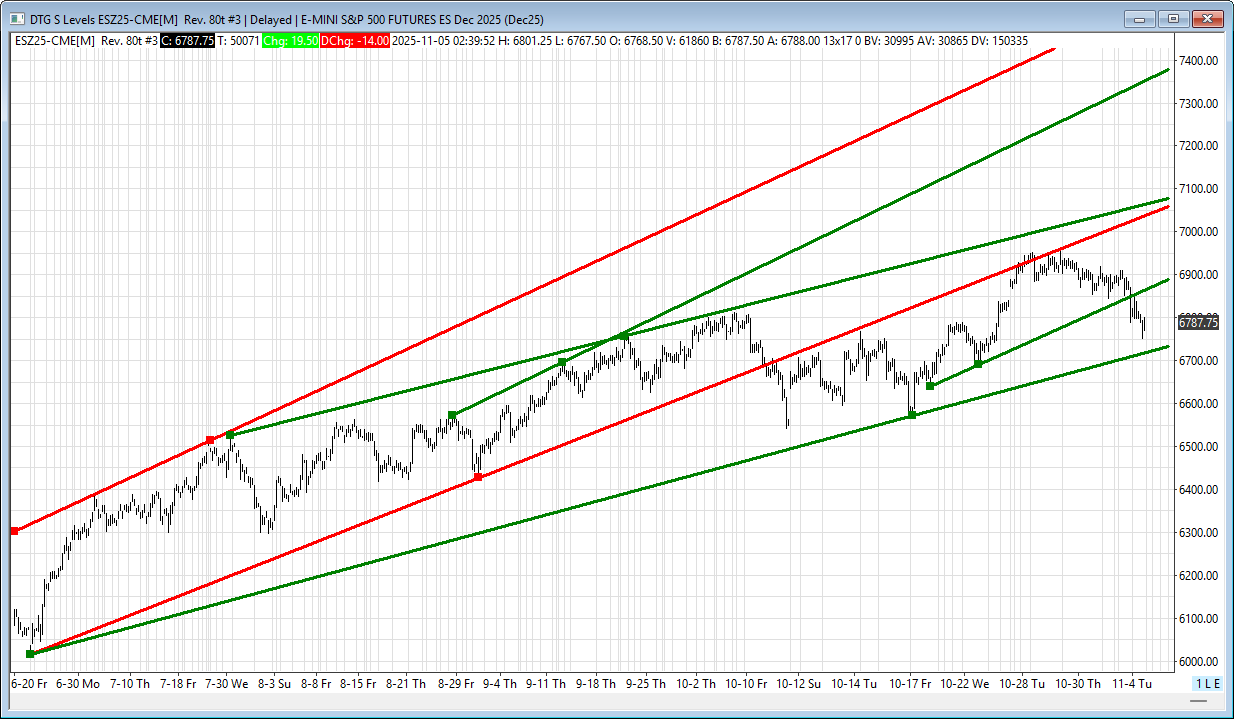 The last two declines off the high were the 178-point drop from 10/9 to 10/10, and the 400-point drop from 8/5 to 8/21. At the current price of 6785.00, the ES is 168.75 points off its 6953.75 high.