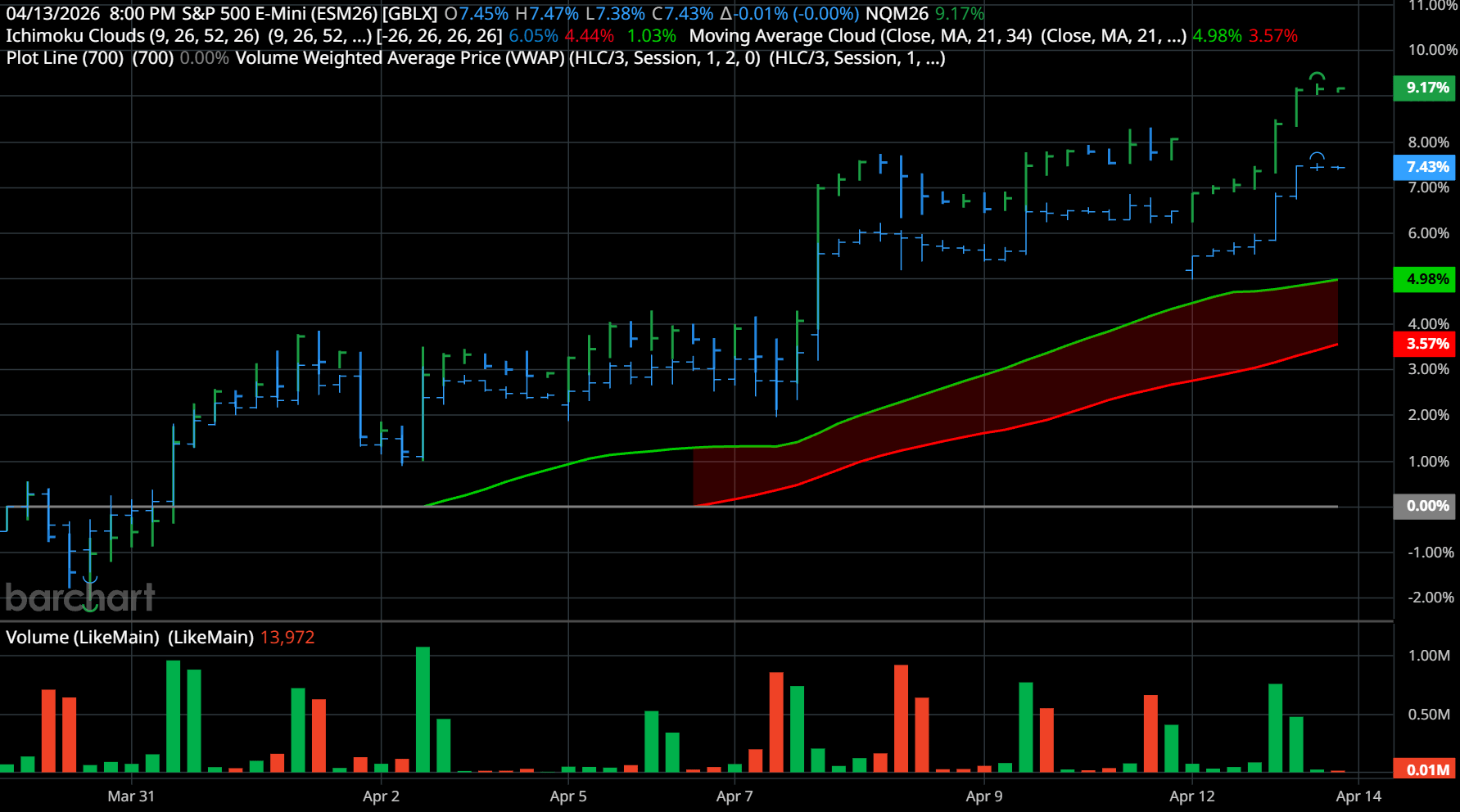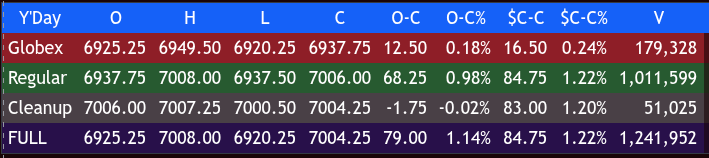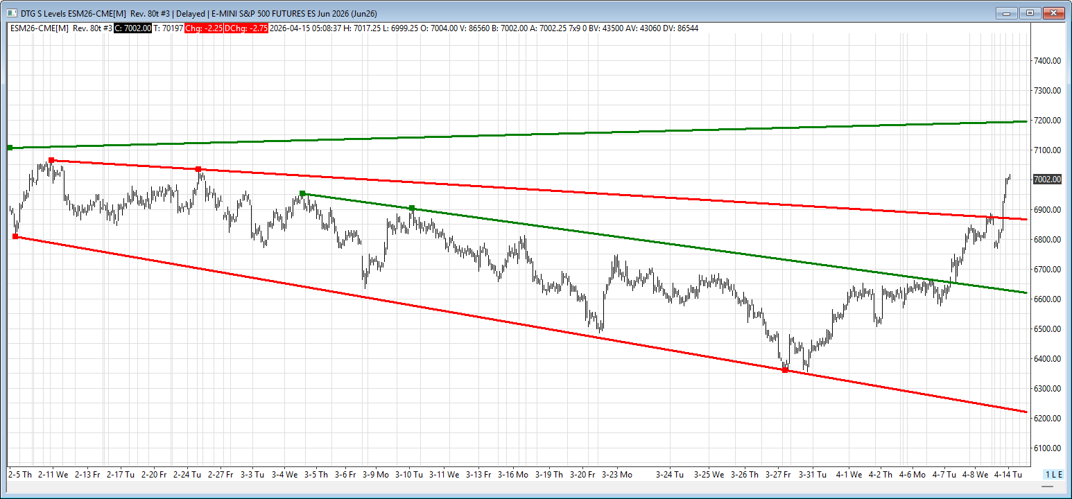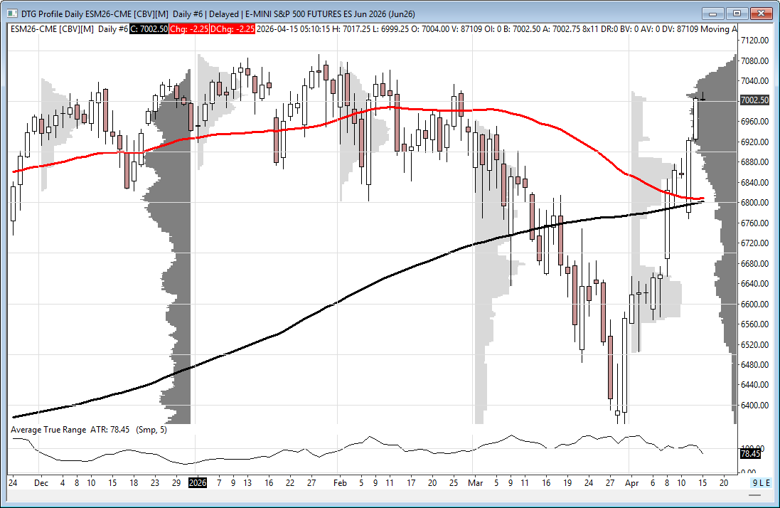 The front-month ESM26 contract high was set on 01/28/26 at 7097.00, and yesterday it made a high at 7008.00; that is only 89 points, or 1.27%, away. So far, there have been positive bank earnings, and this morning BofA and Morgan Stanley report earnings, which I think will also be good.