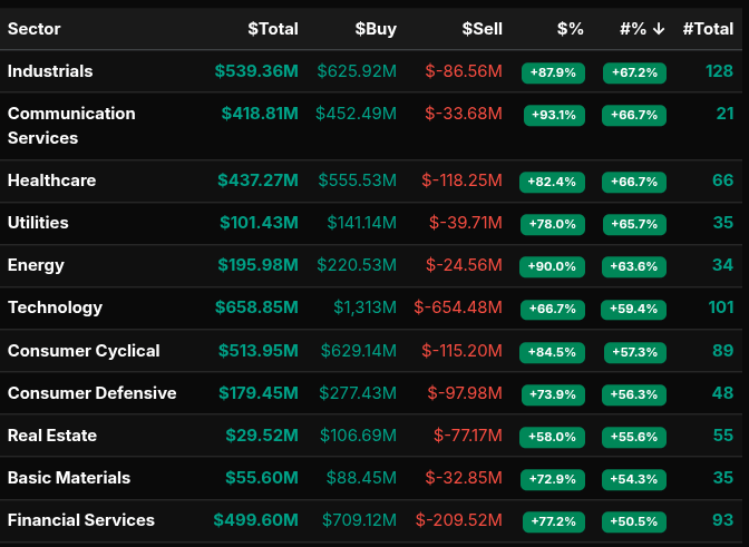 Sector imbalance data leaned bullish in tone — Communication Services, Industrials, and Energy all showed +80–90% buy ratios — but those flows did not translate into index-level resilience as Technology and Financial Services both moderated by the close.