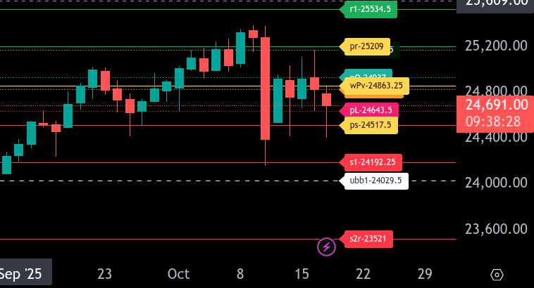 On the upside, resistance appears near 25,209, our upper range target. Above that, 25,534.50 becomes the next resistance zone. A sustained move and hold above 24,863.25 would shift bias back to bullish and set up a test of 25,179.50 and then 25,209.
