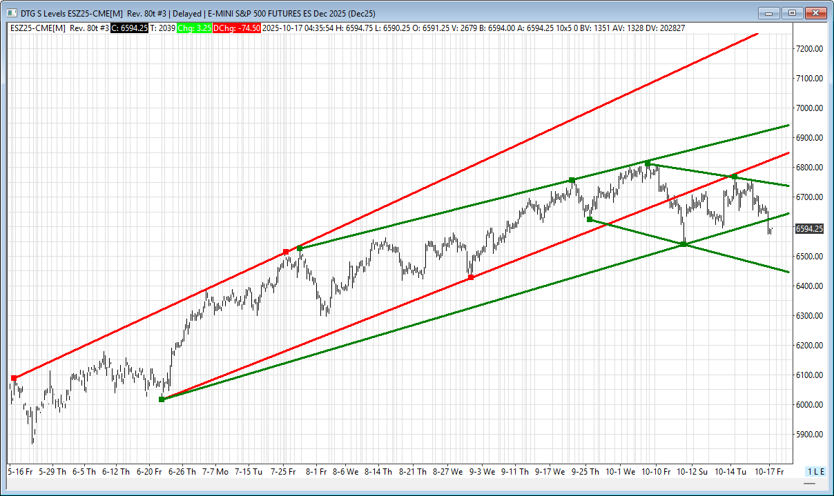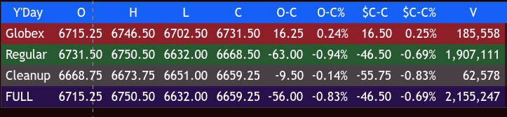 As the 9:30 ET cash open approached, ES began to soften. The regular session opened at 6731.50 and made an early high of 6750.50 by 10:40 before reversing sharply. Sellers drove the contract down to 6632.00 by 14:30, marking a -118.5-point slide (-1.75%) from the morning peak. Prices chopped around before a final rally attempt to 6674.25 at 15:55.