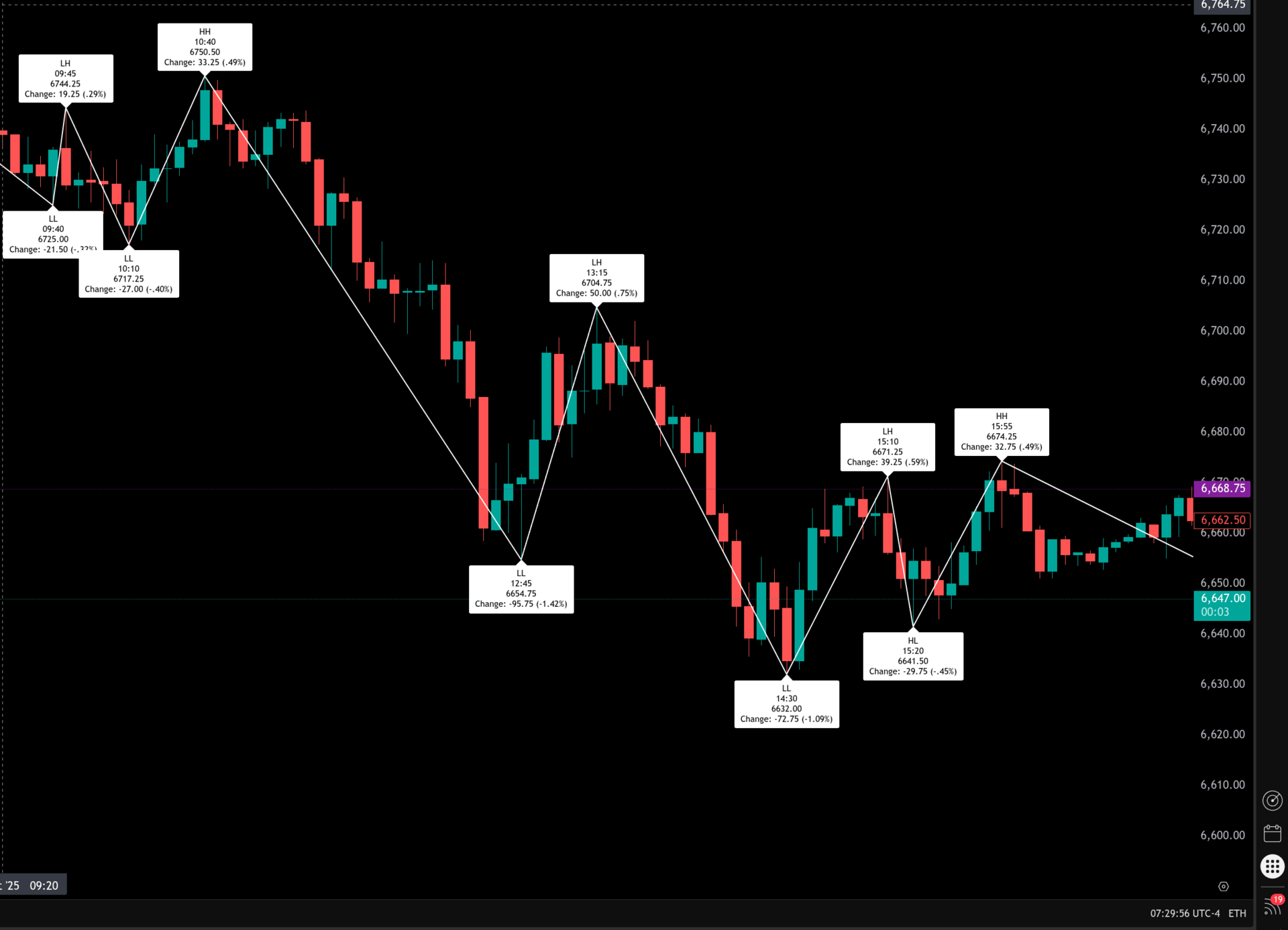 Thursday’s tone was broadly bearish as the market failed to sustain early overnight strength. Despite several intraday rallies, each rebound produced a lower high, a classic sign of distribution. Momentum favored sellers from mid-morning onward, and the afternoon’s attempt to stabilize above 6670 was met with persistent supply.
