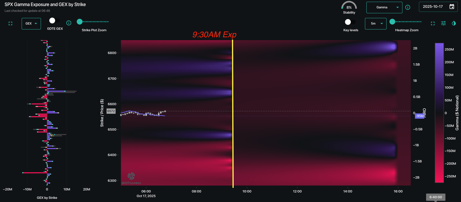 9:30AM SPX expiration will clear out a fair amount of gamma as you can see in the TRACE map. To the right of the yellow line (>9:30AM exp), we see mostly negative gamma (red) around ATM levels. If you loo >4PM expiration we see all red, indicating this market is essentially pure negative gamma which is indicative of further 2-way volatility.