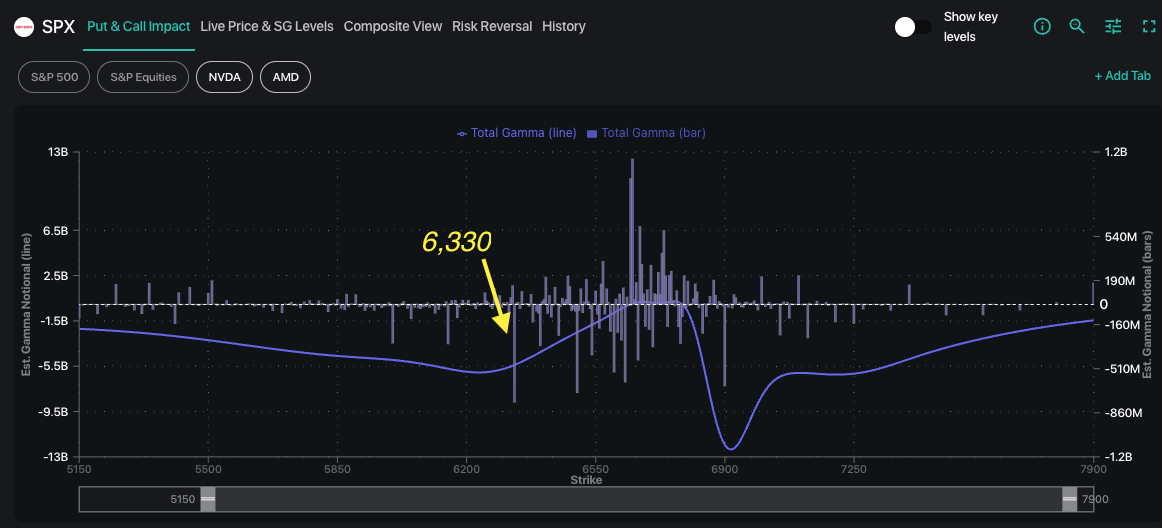 If you are looking for worst case scenarios, we note that the negative gamma doesn’t wane until ~6,330, which is the location of the big 12/31 JPM put strike. Below this level positioning wanes sharply, suggesting dealer-induced downside would drop.