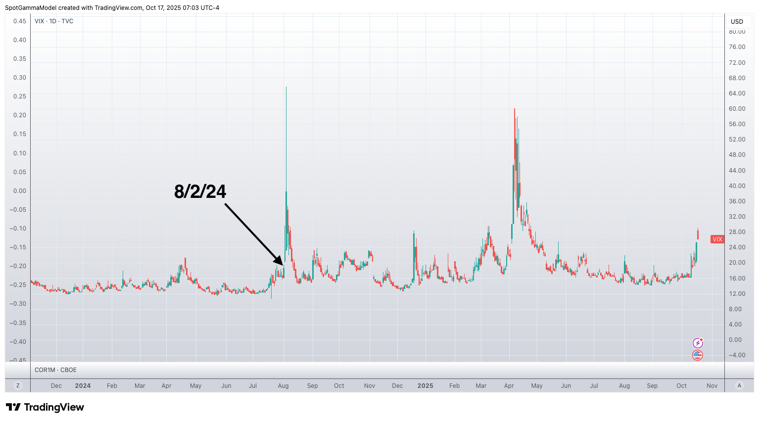 That being said, you generally don’t want to be short vol into a crashy weekend. We spend a lot of time last week comparing this period to July ’24, which is when the SPX fell 5-10% over July as correlations unwound. This culminated in the August 5th VIX >50 episode (marked below). For this to mirror that incredible day, we’d have to 1) have a weekend catalyst (it was a carry trade flare-up then) and 2) we have OPEX now which may clear out some of the tinder (vs mid-exp cycle in ’24).