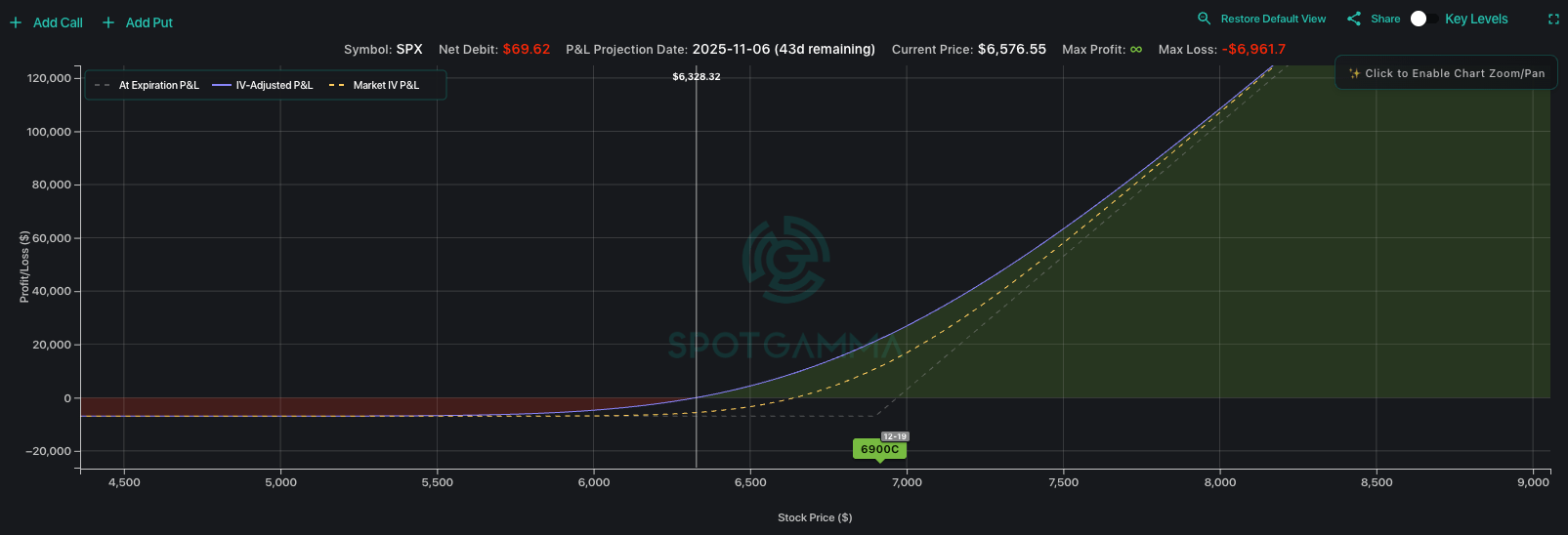 In this case, if the market were to rally the ATM IV would drop, but we also think call skew would pick up. Given that, our new options calculator (launching this month!) shows IV holding pretty flat for this specific SPX ~6,900 call (solid line = our IV projection PNL vs dashed line = current IV). Now we are not suggesting you go hog-wild loading up on calls, but you could easily see a big jump in markets with OPEX clearing, + AI earnings/Trump/XI deal, and maybe even a resolution to the Ukraine conflict. If all that goes south, which is also a real possibility, then the calls offer fixed downside risk.