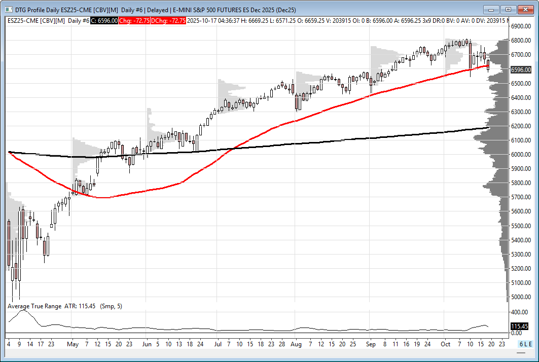 The ES traded modestly higher overnight in the October 16 session, opening at 6715.25 followed by a pullback to 6702.50 around 20:40 (-0.36%) and another dip to 6705.75 at 22:30. From there, buyers regained traction, lifting prices toward 6745.25 at 07:20 and a session high of 6746.50 by 08:40 — a 39.5-point climb from the prior low.