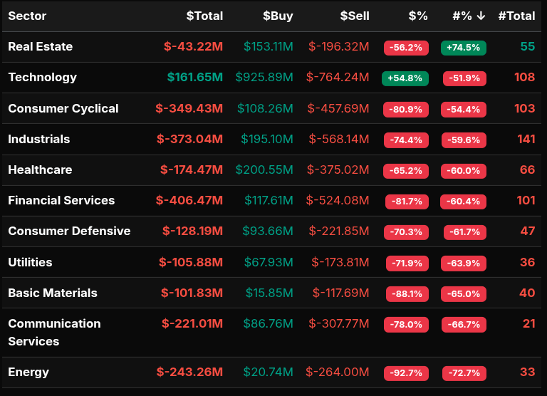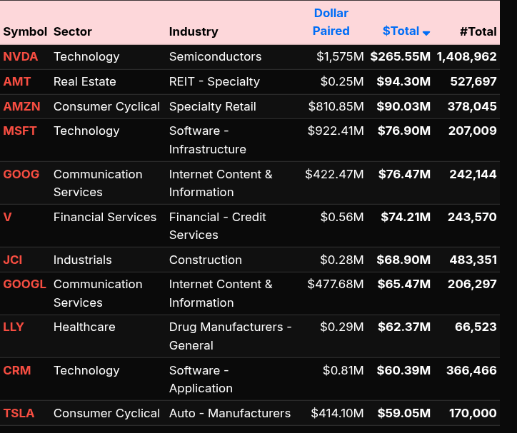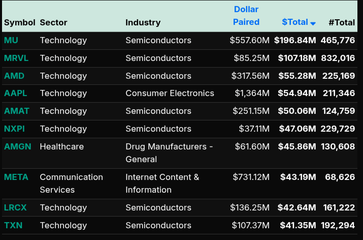 At the symbol level, flows were concentrated and telling. NVDA (+$265M), MU (+$196M), and MRVL (+$107M) led the buy side, highlighting strong semiconductor demand. Additional accumulation in names like AMD, AAPL, and AMAT confirmed a clear tech/AI-driven bid. Meanwhile, sell pressure was expressed through broader index and cyclical exposure, with names like AMZN and TSLA showing weaker participation relative to their sectors.