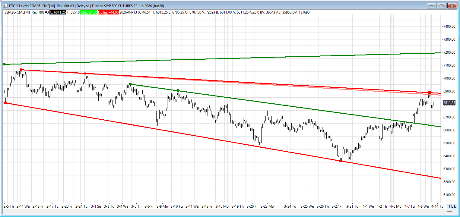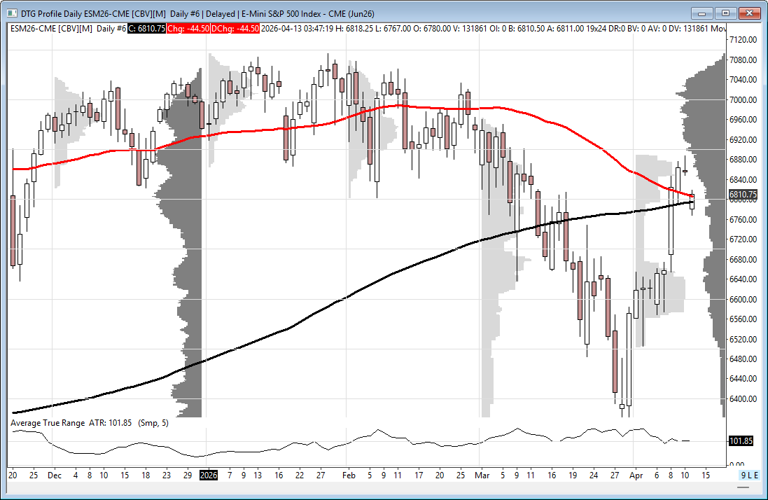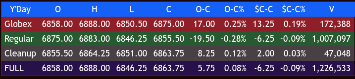 The bull/bear line for the ES is at 6860.00. This remains the key pivot for today’s session. Acceptance above this level will shift momentum back to the upside, while continued rejection keeps the market in a weaker, corrective posture.