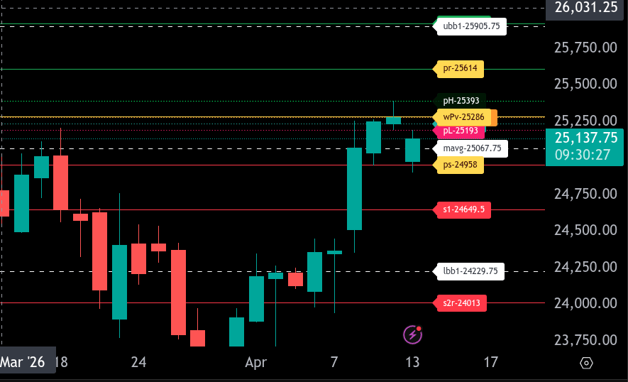 Overall, the market is attempting to stabilize after a strong move higher, but remains below the key pivot at 25286.00. Sellers maintain control unless that level is reclaimed, while buyers need sustained acceptance above it to continue the upward trend.
