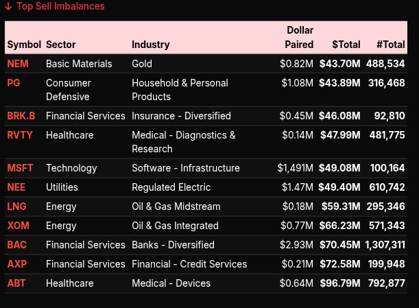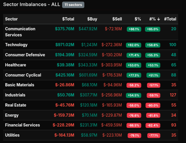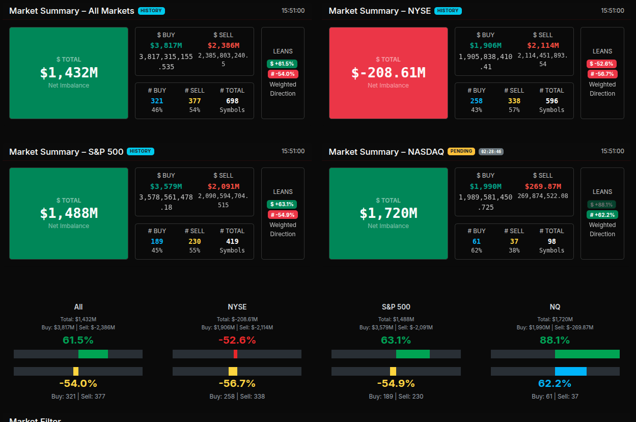 The MOC auction opened at 15:51 with a strong $1.43B buy imbalance, driven largely by tech, communication services, and consumer cyclicals. The early surge showed a 61.5% positive dollar lean, but the symbol lean ran -54%, signaling that while dollars were concentrated in fewer, larger names, most symbols were actually skewed to the sell side — a classic sign of rotation underneath a headline buy imbalance.