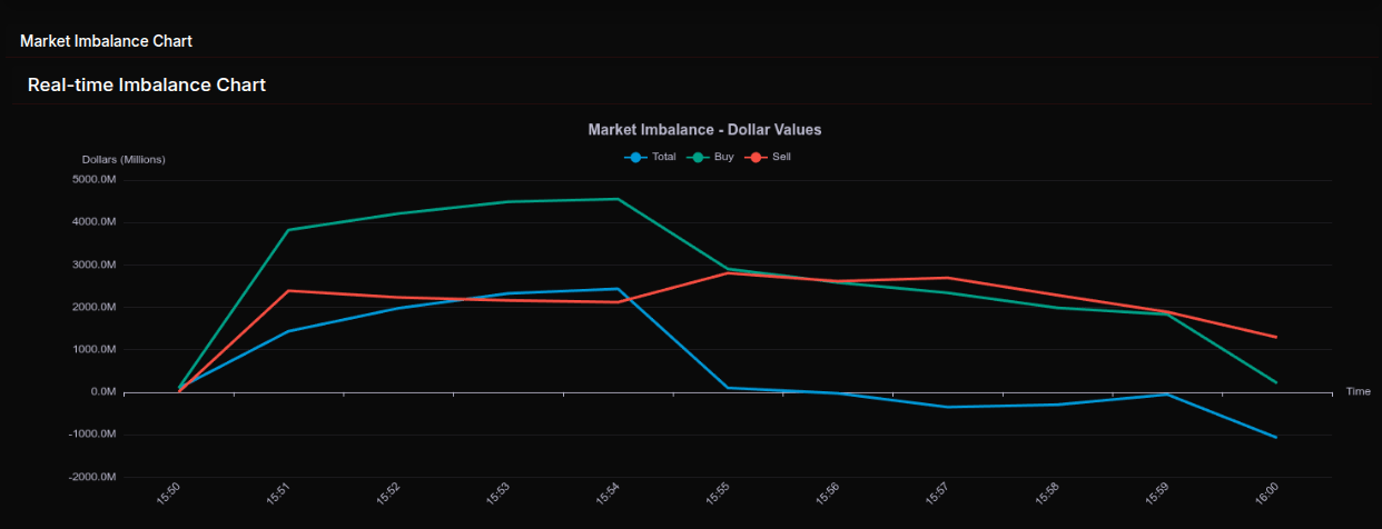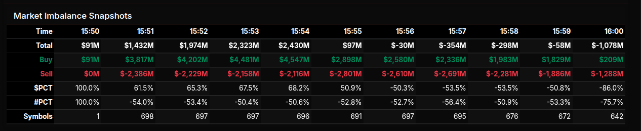From 15:51 to 15:54, buy pressure climbed steadily, peaking near $4.5B, while sell flows held between $2.1B–$2.3B, keeping the net imbalance solidly positive. But by 15:55 the auction tone shifted. The net collapsed to just $97M, and by 15:56 the imbalance flipped negative (-$30M) as sell pressure widened. This transition continued: at 15:57 the net hit -$354M, and into the final print it deteriorated to -$1.07B, ending the auction decisively on the sell side.
