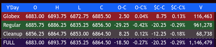 The ES popped up to 6863.75 at 1:00, sold off down to a new low at 6835.25 at 2:55, traded up to 6847.75 at 2:50, then down to 6840.00 at 3:35. It traded 6845.00 as the 3:50 cash imbalance showed $1.2 billion to buy, shot up to 6867.00, and settled at 6864.50, down 20.25 points or -0.29% from the previous close.
