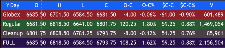 After the ES made its late high, I said the next 50 to 60 points were going to be down, and the ES just traded down to 6762.25 at 8:10 pm. That’s 57 points off the ES 6918.25 high.