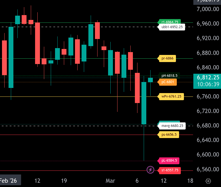 S/R LEVELS — Close: 6,801.00 | 03/09/2026