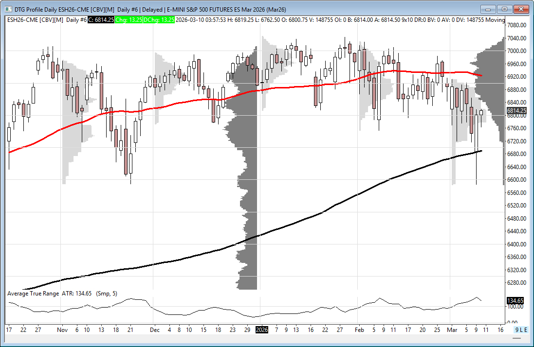 ES rebounded Monday and closed back above the 200-day MA (~6690), which remains key long-term support.