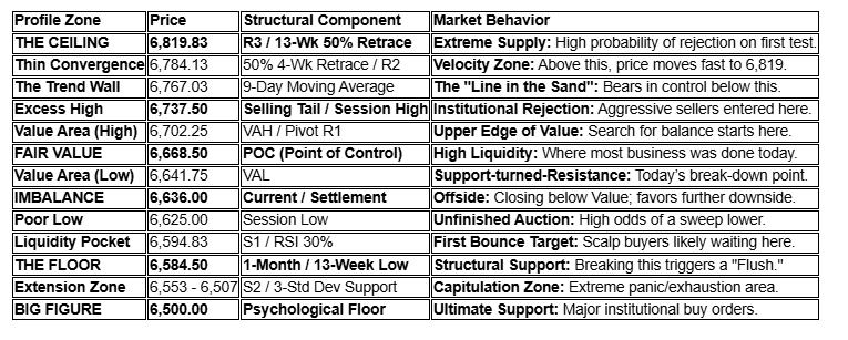 The “b-Shape” Logic: Today’s profile is a classic Long Liquidation (b-shape). The POC at 6,668.50 is significantly higher than the Close at 6,636.00. This tells us that the “fair price” was higher, but the market lacked buyers at the end of the day, causing a “slump.”