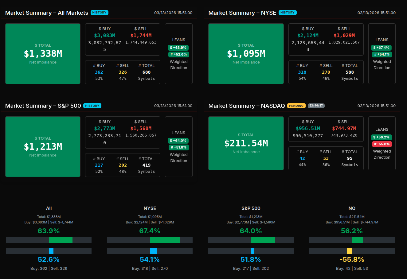 The March 13th Market-on-Close (MOC) auction developed as a strong buy program through most of the imbalance window before fading into a sell skew at the final print. Early indications showed aggressive institutional demand, particularly across cyclical and industrial sectors, before a late rotation pushed the final imbalance negative.