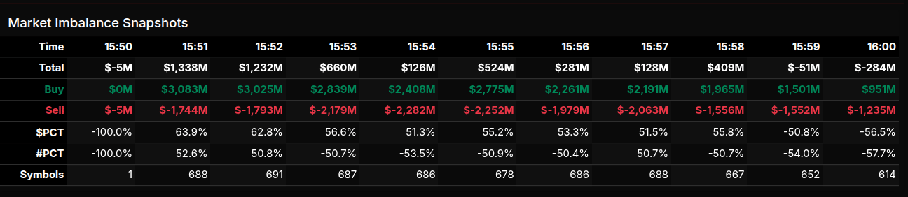 Into the final minute, the imbalance abruptly reversed. At 15:59, the market flipped to a $51M sell imbalance and ultimately closed with approximately $284M to sell as sell orders overwhelmed the remaining buy interest. The transition from broad institutional buying to a late sell imbalance illustrates a classic closing rotation, where early demand is absorbed and the final auction clears through supply.