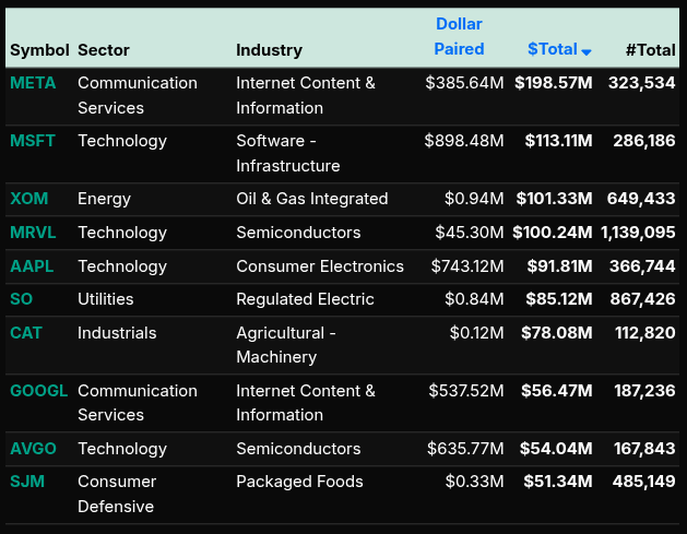 Individual symbol activity highlighted the institutional focus. META ($198.6M), MSFT ($113.1M), XOM ($101.3M), and MRVL ($100.2M) led the buy side, with strong semiconductor participation also appearing in AVGO and AAPL. On the sell side, COST (-$113.5M) and LRCX (-$56.7M) were among the largest imbalances.
