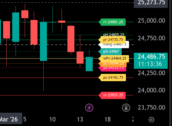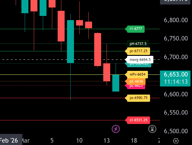 Linear point projection (simple average daily loss): A further drop of around -257 points total. From the recent settlement/close near 6,625–6,636 (e.g., settled ~6,636 on March 13, with levels trading in the 6,625 zone), this would target roughly 6,368–6,379.