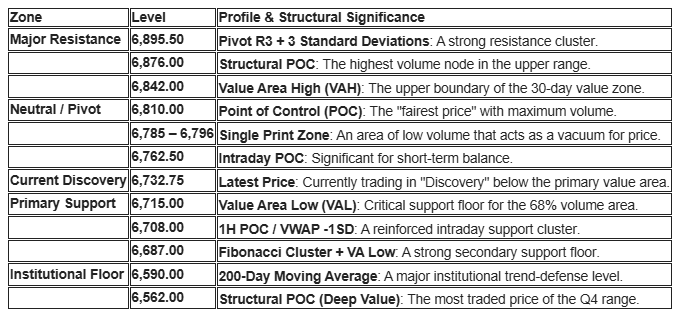 • Bearish Value Migration: The distance between the current price (6,732.75) and the primary POC (6,810.00) shows significant overextension to the downside. While a mean-reversion move back to the POC is a high-probability play, it requires the Pivot Point at 6,732.08 to hold.