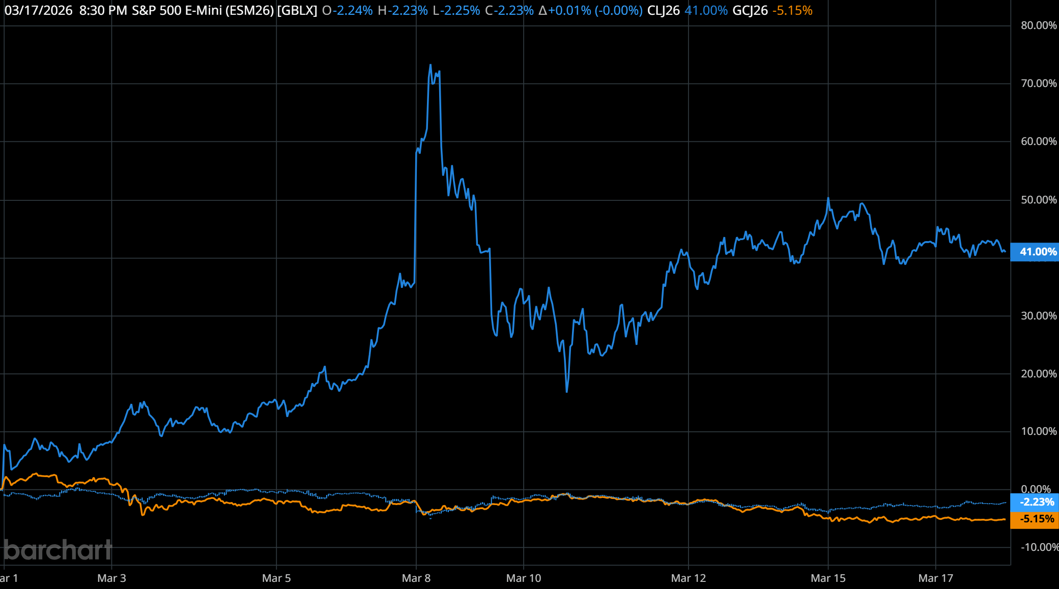 Above is a 15-day comparison chart of the ESM26 (June S&P future), the CLM26 (April Gold future), and the GCJ26 (April Gold). As you can see, the CL is up almost 41.23% while the ES is down 2.23% and gold is down 5.09%. Clearly, it’s been all about the energy markets!