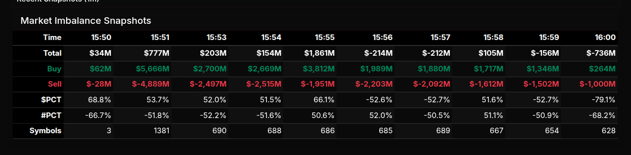 The ES then pulled back to the 6770.25 level, rallied up to 6780.50 at 3:15, traded down to 6771.50 at 3:40 and then 6776.25 at 3:50. As the cash imbalance showed $400 million to buy, the ES traded down to 6769.00 and traded 6771.25 on the 4:00 cash close.