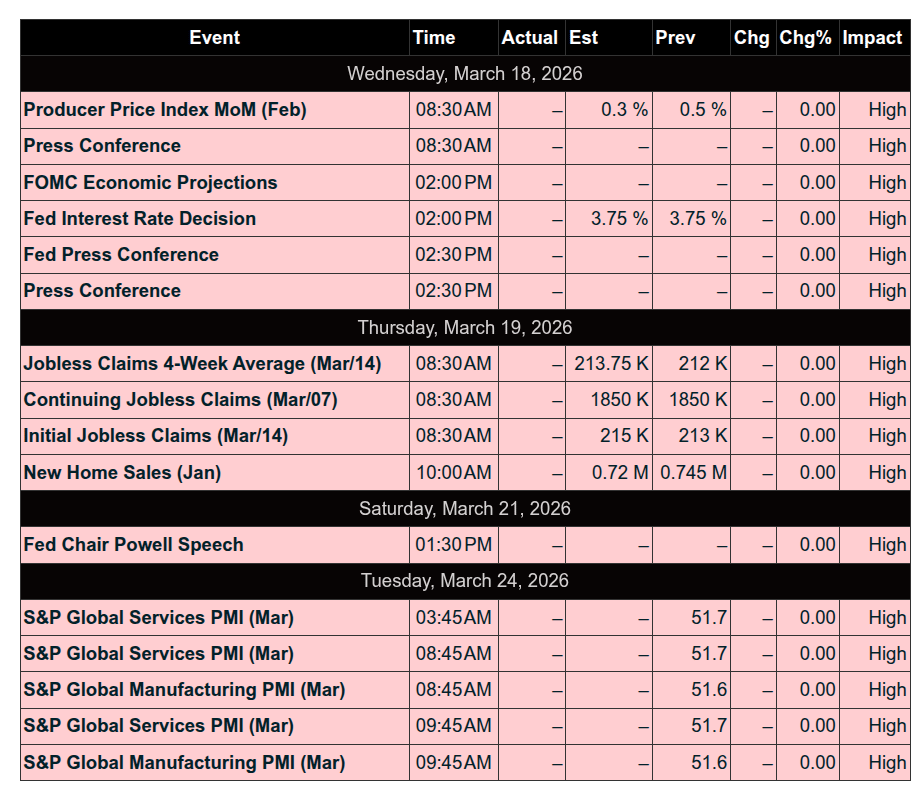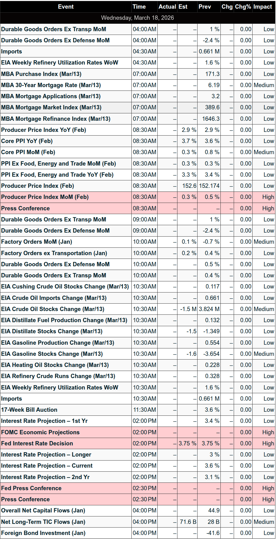 Wednesday, Mar 18: PPI Inflation Data (8:30 am); Factory Orders (10:00 am); FOMC Rate Decision (2:00 pm) & Chair Powell Presser (2:30 pm)
