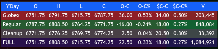 After 4:00, the ES did a sideways to up back and fill up to 6776.26 and settled at 6773.25, up 17.75 points or +0.26%, and up 1.30% over the last two sessions. The NQ settled at 25,015.50, up 124.25 points or +0.50% or up 1.66% over the last 2 sessions, the YM settled at 47,348, up 59 points or +0.12% and up 0.98% over the last 2 sessions, and the RTY settled at 2536.80, up 15.90 points or 0.63% or up 1.63% over the last 2 sessions.
