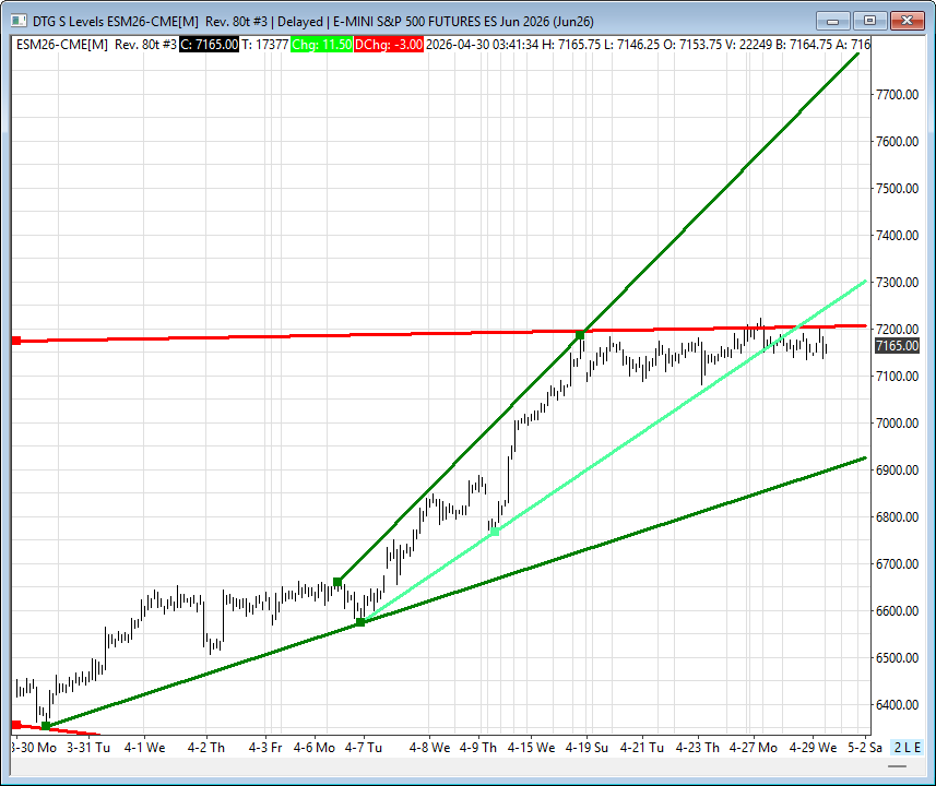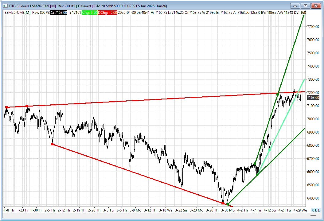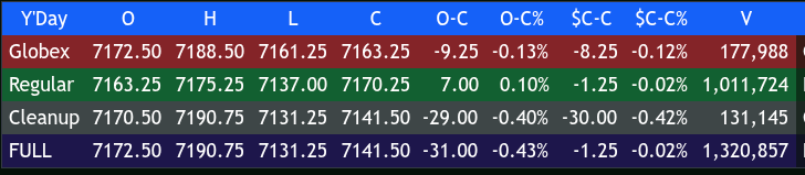 Sometimes the weeks seem to drag on, and this week is one of them. The ES made a high at 7288.50 and a low at 7161.25 on Globex, with a total of 182k contracts traded, and opened Wednesday’s regular session at 7163.25, down 8.25 points or -0.12%.