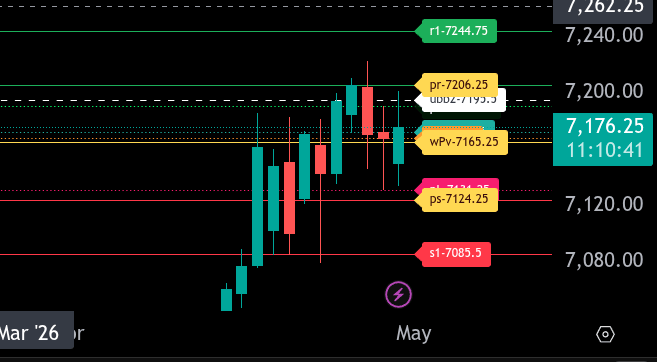 Overall, the market is attempting to stabilize above the bull/bear line after a strong overnight push. Holding above 7165.25 keeps the tone constructive, while failure to hold this level would shift focus back to the lower range targets.
