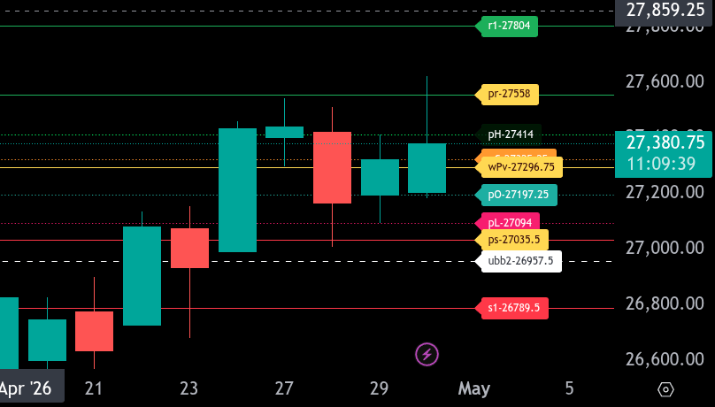 Overall, the market is showing bullish positioning above 27296.75, but still within a broader range. Continued acceptance above the bull/bear line favors upside continuation, while a failure back below it shifts focus to lower support targets.